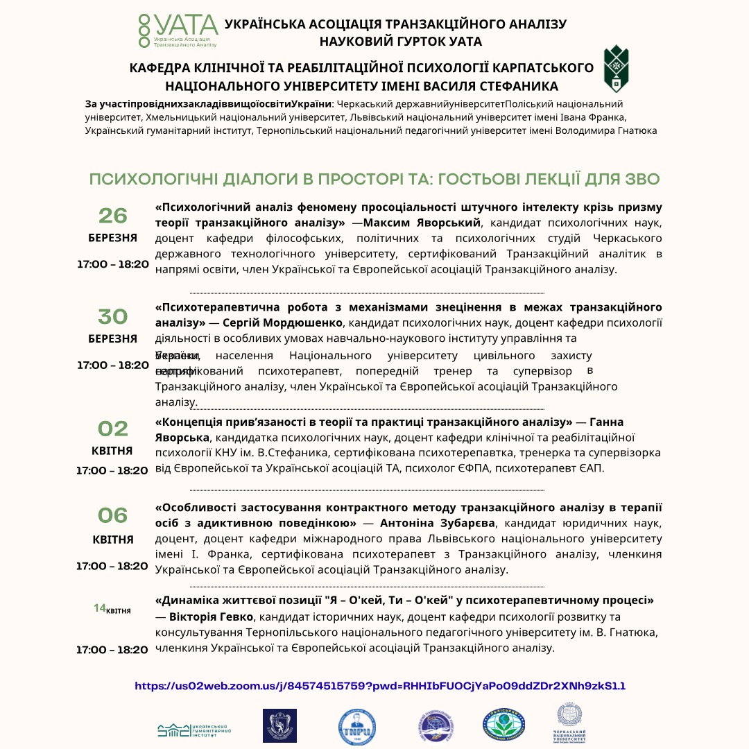 Психологічні діалоги в просторі ТА: гостьові лекції для ЗВО. Програма.