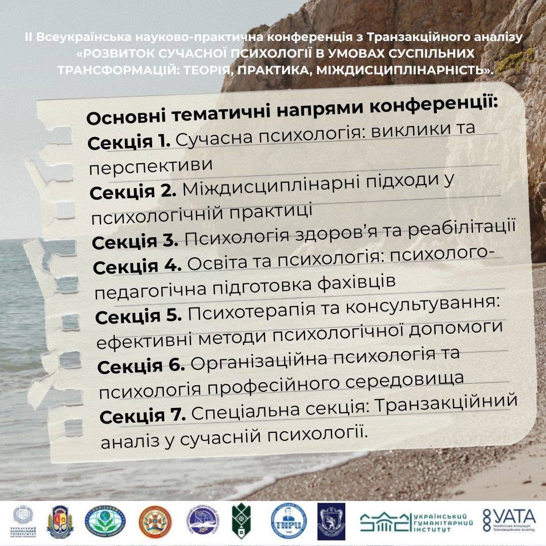 ✅Організатори заходу – Українська Асоціація Транзакційного Аналізу, Карпатський національний університет імені Василя Стефаника, Черкаський державний технологічний університет, Хмельницький національний університету, Уманський державний педагогічний університет імені Павла Тичини, Тернопільський національний педагогічний університет імені Володимира Гнатюка, Поліський національний університет, Національний університет цивільного захисту України, Львівський національний університет імені Івана Франка, Український гуманітарний інститут.